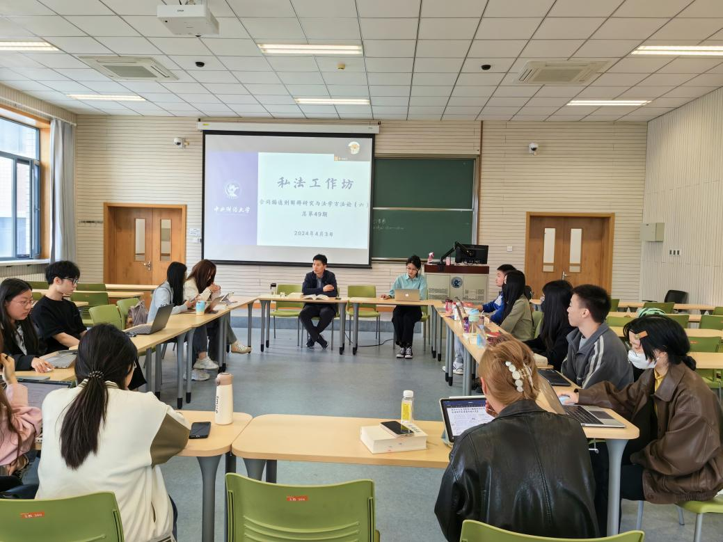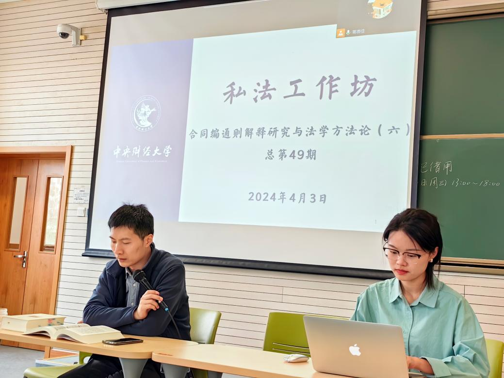 2024年4月3日下午14时至17时30分,中央财经大学法学院第49期私法工作坊在学院南路校区主教306如期举行。我院武腾老师和二十余名本科生、硕士研究生共同研讨了《民法典合同编通则司法解释》第42条至第49条的内容,并研读了《法学方法论》第四章的内容。钟云昌、宋雯萱、马骁、唐思佳同学分享了对《民法典合同编通则司法解释》相关条文的理解,方睿婕、都可欣、赵超凡、蒋蓓佳同学汇报了阅读《法学方法论》相关内容的体会。