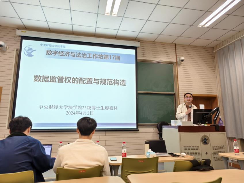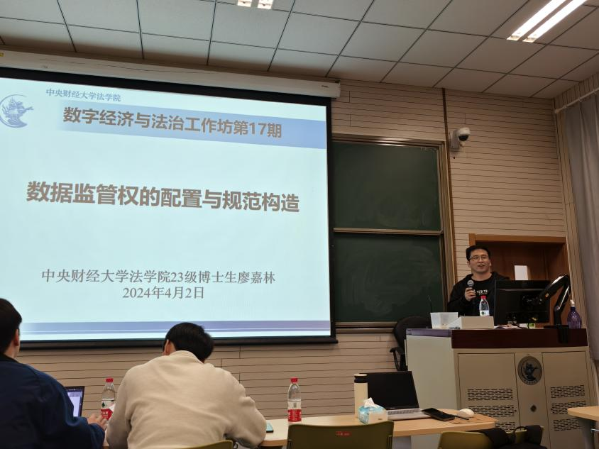 4月2日晚,中央财经大学法学院数字经济与法治工作坊第17期在学院南路校区主教308教室顺利开展。本期活动以“数据监管权的配置与规范构造”为主题,我院王世杰讲师担任主持人,博士生廖嘉林担任报告人,博士生董畅、硕士生李晨、张效科担任评议人,全校30余位师生参加活动。