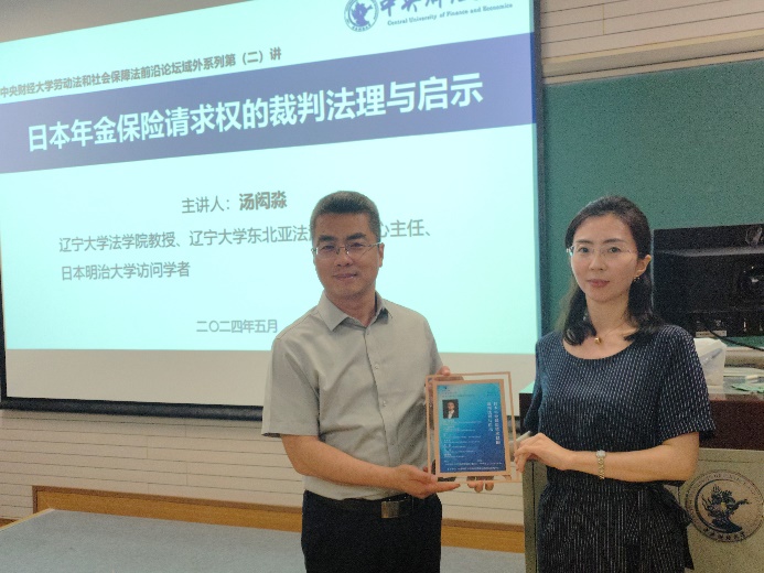 2024年5月31日晚,劳动法和社会保障法前沿论坛·域外系列第二讲在学院南路校区主教212教室举办。辽宁大学东北亚法治研究中心主任,日本明治大学访问学者汤闳淼教授为我院师生作“日本年金保险请求权的裁判法理与启示”的主题讲座。讲座由中央财经大学劳动法和社会保障法研究中心主任沈建峰教授主持,中国政法大学民商经济法学院社会法研究所所长娄宇教授、中国社会科学院法学研究所社会法室副主任王天玉研究员、首都经贸大学劳动经济学院范围教授、中国劳动关系学院科研处处长兼法学院院长肖竹教授以及中国人民大学法学院陈靖远助理教授等五位老师担任本次论坛的与谈人。法学院部分博士研究生、硕士研究生以及本科生共70余人参与了本次论坛。
