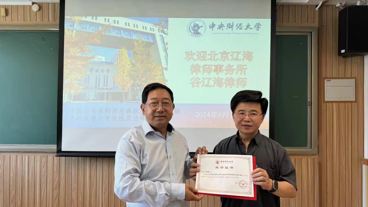 讲座最后,曹富国教授代表法学院向谷辽海律师颁发讲座纪念证书,对谷辽海律师的讲座表示感谢,并希望通过交流合作,进一步推动我校公共采购学科的发展。