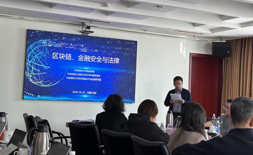 2024年10月19日,由中央财经大学信息学院主办、中央财经大学法学院协办的“区块链、金融安全与法律”研讨会于昌平区中国石化会议中心举行,来自福州大学、北京理工大学、北京互联网法院、盈科(上海)数字经济法律事务部、江苏容睿律师事务所等学术界和实务界特邀嘉宾,及中央财经大学信息学院、法学院、金融学院多名教授、博士生和硕士生50多人出席研讨会。信息学院朱建明教授作会议主题介绍,本次研讨会分为“密码学与金融安全”“区块链与信息安全”和“区块链法律”三个主题。