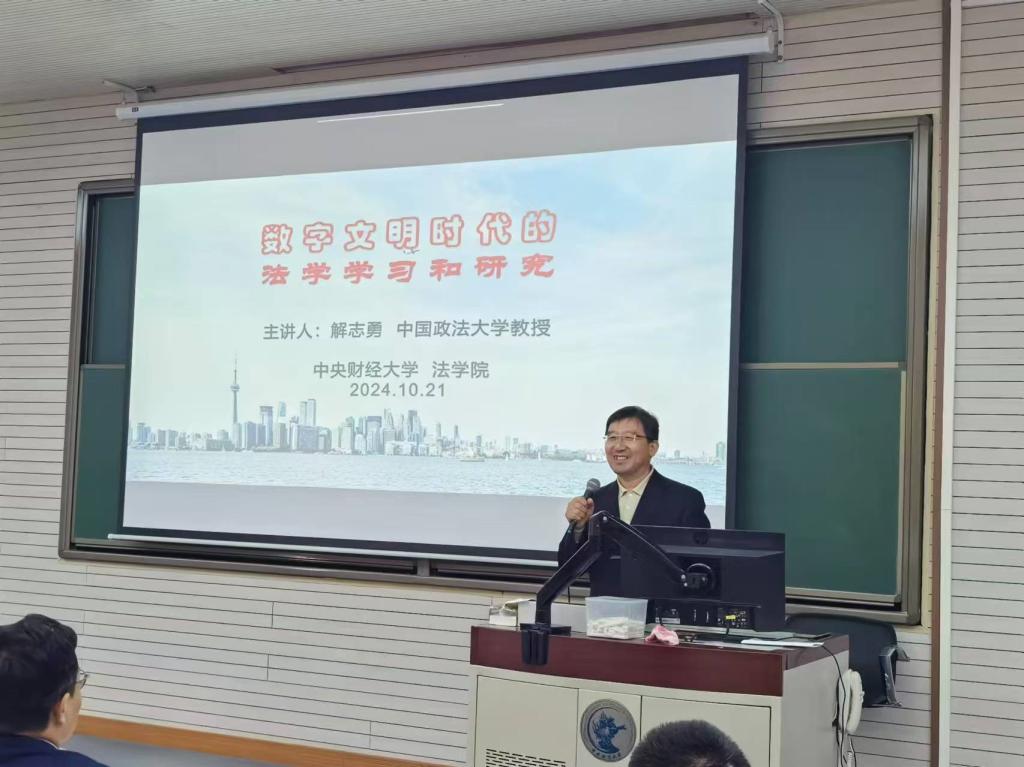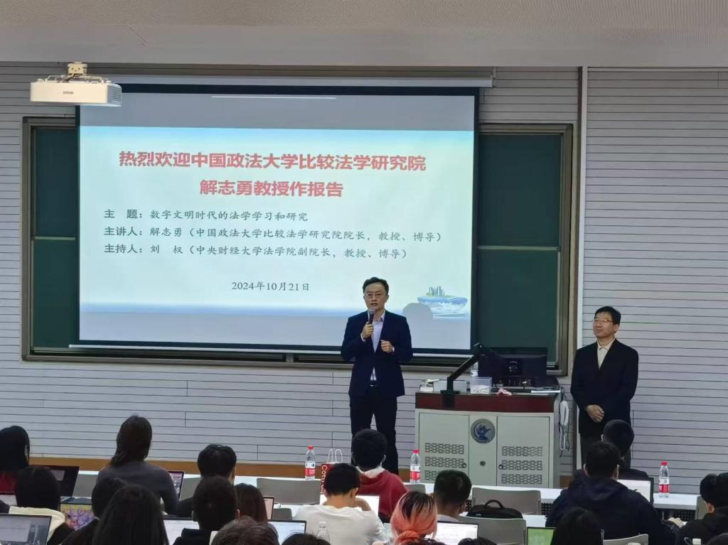 2024年10月21日下午,中国政法大学比较法学研究院院长、教授、博士生导师解志勇老师莅临我校,以“数字文明时代的法学学习和研究”为主题作专题讲座。讲座由中央财经大学法学院副院长刘权教授主持,法学院赵真副教授、刘馨宇讲师、张泽宇讲师以及各年级硕博研究生、本科生等百余名师生出席了此次讲座。本次讲座为法学院建院20周年系列讲座第2期,同时也受到中央财经大学“龙马奋进•75周年校庆”专题学术讲座资助计划支持。