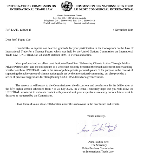 联合国国际贸易法委员会对曹富国教授的发言和讨论给予高度评价。联合国贸法会秘书长Anna Joubin-Bret女士发来致谢信。致谢信写到,“您对关于“通过公私伙伴关系加强气候行动”的第三小组讨论和整个研讨会做出的深刻而卓越的贡献,不仅使广大听众受益,使其了解贸易法委员会在公私伙伴关系领域的文本是否以及如何适合于支持实现国际社会设定的气候行动目标的目的,也为加强贸易法委员会法规以创造更绿色的未来提供了一系列实用建议。秘书处将向委员会报告讨论情况和结论,以便在定于2025年7月7日- 25日在维也纳举行的第五十八届会议上进行审议。我真诚地希望您允许贸易法委员会秘书处与您保持联系,并在我们根据委员会的要求在这一领域开展未来工作时寻求您的专业知识。我期待着在不久的将来,我们在此努力下将继续密切合作。”