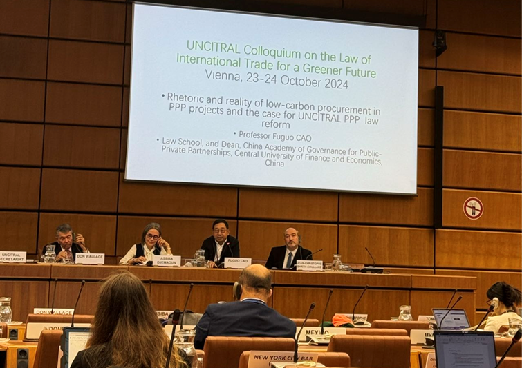 2024年10月23 - 24日,法学院二级教授、我校智库平台政府和社会资本合作治理研究院院长曹富国应邀参加联合国贸易法委员会在奥地利维也纳联合国总部举办的“国际贸易法促进绿色未来”(UNCITRAL Colloquium on the Law of International Trade for a Greener Future)专题研讨会。