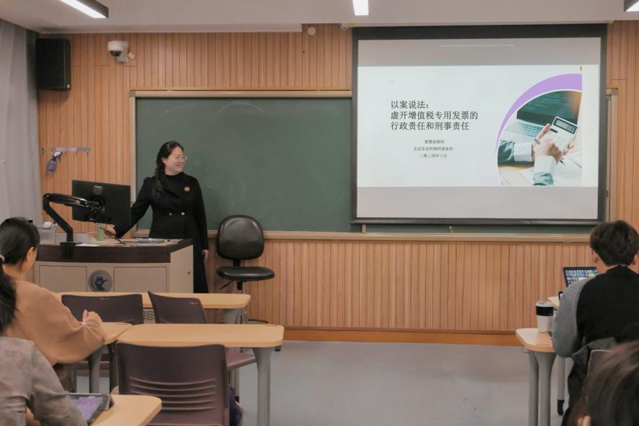 2024年10月21日上午,中央财经大学财税法工作坊第58期在学院南路校区举行。本次工作坊主讲人为京师律师事务所税收法律事务部主任窦慧娟律师,主题为“虚开增值税专用发票的行政责任和刑事责任”。本次工作坊由指导老师郭维真副教授主持,我院部分本科生、硕士研究生参加工作坊。