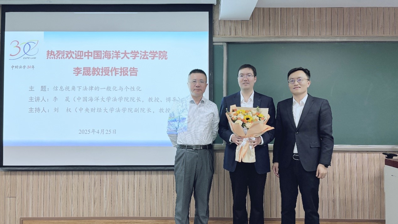 4月25日晚,中财法学30年系列活动之法治中国论坛2025年第3期在主教203教室成功举行。中国海洋大学法学院院长、博士生导师李晟教授主讲“信息视角下法律的一般化与个性化”。本次讲座由中央财经大学法学院副院长刘权教授主持,法学院张小平副教授以及学院本硕博学生参加了讲座。