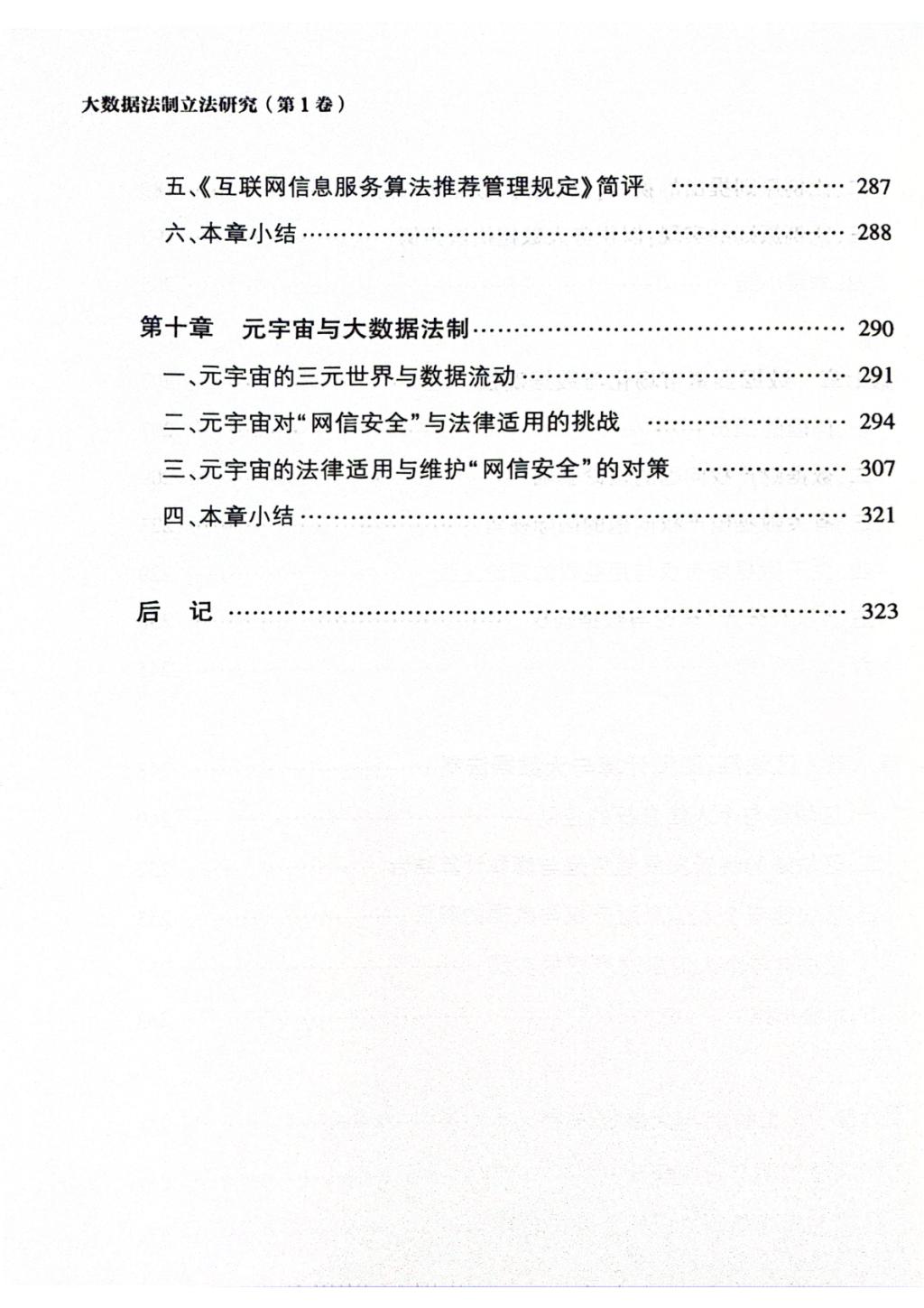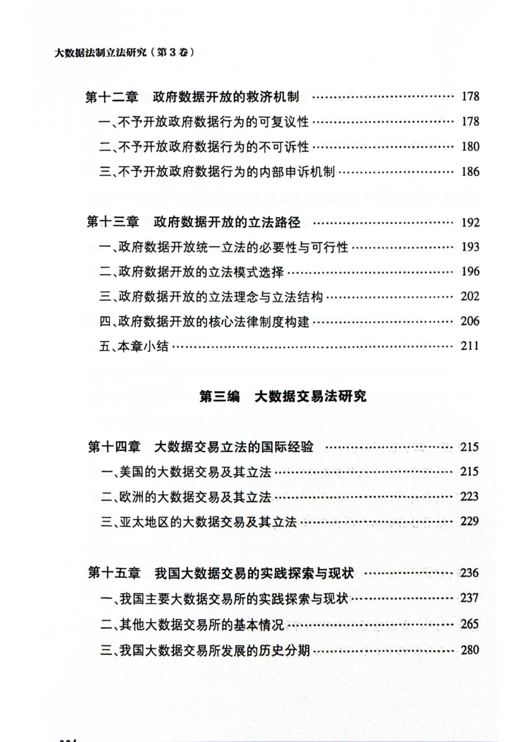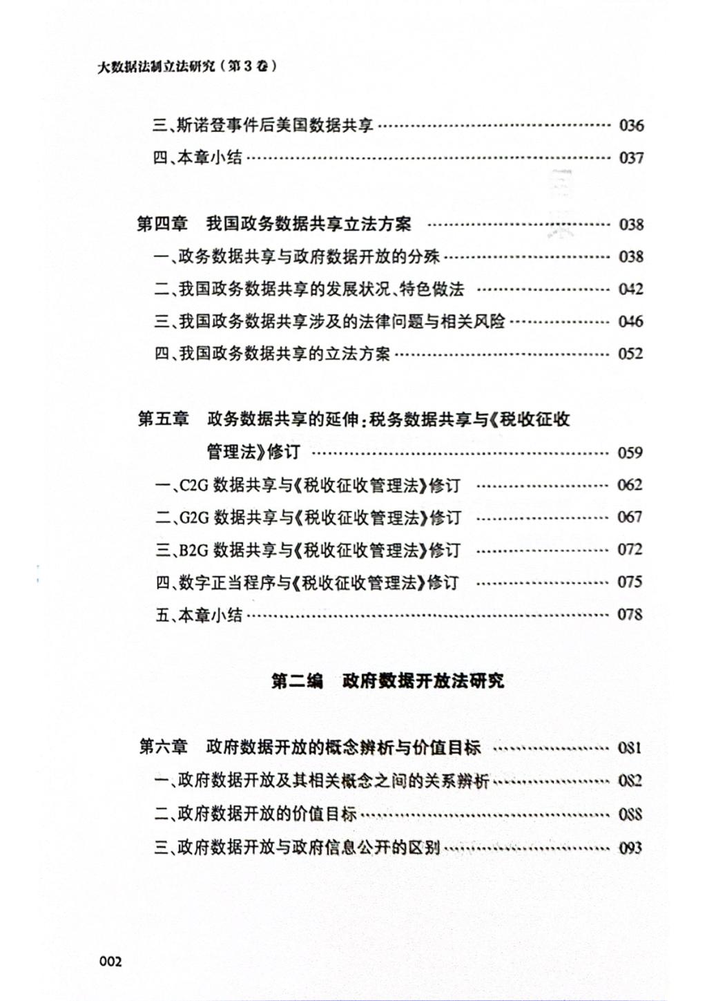 《大数据法制立法研究》共分为四卷,91.6万字。第一卷为《大数据法制立法的基础理论研究》,主要研究相关基本概念、立法模式、立法理念、重要理论等基础理论问题。第二卷为《个人信息保护法的解释、实施与完善》,该部分将重点论述个人信息保护法的解释和实施过程中的若干重要疑难问题。第三卷为《数据共享与开放法律问题研究》,下设三编:第一编为政务数据共享法研究。这是规范政务数据在政务部门之间有序共享,切实保护个人信息权益的重要法律,也是大数据时代亟待立法的法律。第二编为政府数据开放法研究。这是发挥政府掌握的大数据资源,发挥大数据红利,促进创业创新,激发市场活力的重要法律,也是大数据时代亟待立法的法律。第三编为数据交易法研究。这是盘活企业掌握的数据资源,促进企业之间数据资源共享的重要法律,是大数据时代亟待立法的重要法律。第四卷为《数据跨境流动法律制度研究》,重点论述数据跨境流动所涉及的个人信息保护法和数据安全法问题。