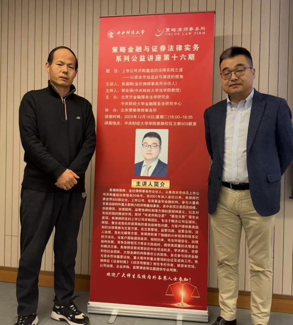 12月16日下午,中央财经大学法学院法律实务论坛暨策略金融与证券法律实务系列公益讲座第十六期在学院南路校区顺利举行。本期讲座由中央财经大学策略公益讲座基金资助,特邀北京金杜律师事务所合伙人焦福刚律师,就“上市公司并购重组的法律实践之道——以资本市场适应与演进的视角”进行专题分享。讲座由法学院邢会强教授主持。