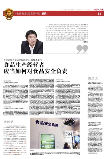 为加强《食品安全法》宣传工作,《中国食品安全报》2015年4月26日邀请中国人民大学、清华大学、国家食品药品监管总局、国家卫计委等专家撰文解读。中央财经大学法学院高秦伟教授发表整版文章,谈食品生产经营者如何对食品安全负责。全文如下——