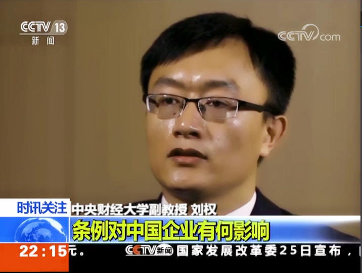 2018年5月23日,中央电视台新闻频道专程赴中央财经大学,就欧盟《通用数据保护条例》对中国企业的影响及应对策略,采访我院刘权副教授。采访视频于《通用数据保护条例》生效当日即5月25日,在央视新闻频道《国际时讯》栏目首播,随后于5月26日在央视《朝闻天下》《新闻直播间》等多个栏目滚动播出。