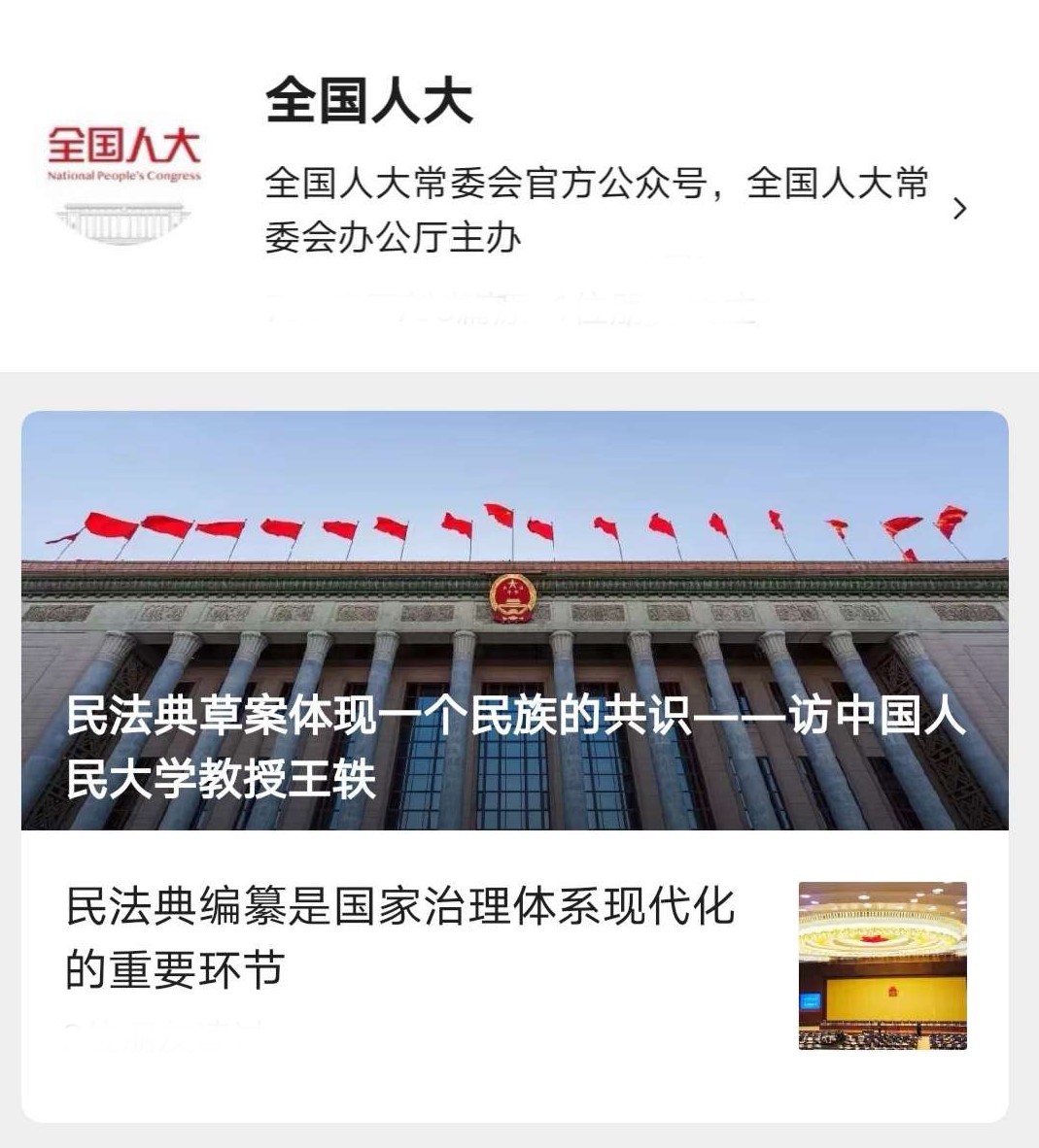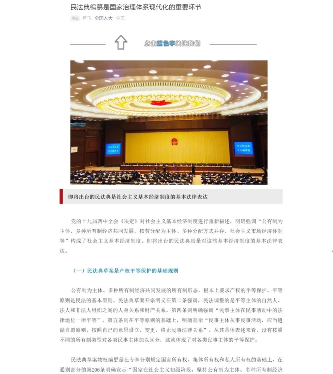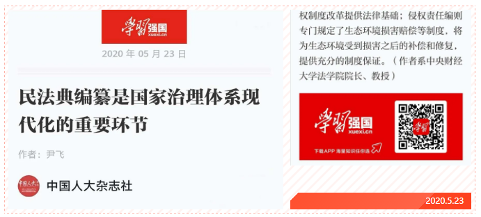 5月22日上午,第十三届全国人民代表大会第三次会议在人民大会堂开幕,其重要议程之一是审议民法典草案,受全国人大常委会委托,当日全国人大常委会副委员长王晨作关于民法典草案的说明。同一天,全国人大常委会公众号全文推送我校法学院尹飞教授受邀撰写的文章《民法典编纂是国家治理体系现代化的重要环节》,对民法典编纂的重要意义进行解读。