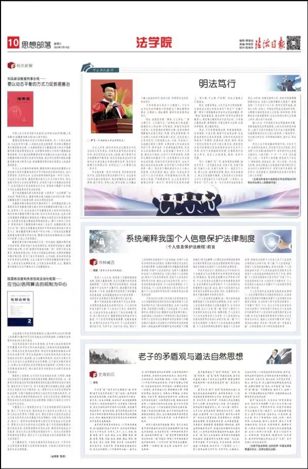 担任中央财经大学法学院院长以来,尹飞教授始终将学生的德育教育放在首位,坚持立德树人、德法兼修、明法笃行的教育理念。他指出,明法的前提是崇德,并希望同学们未来能做到“明大德、守公德、严私德”,真正实现行稳致远。其中,明法,意味着遵守法律,敬畏法律,通晓法律。笃行,即忠诚专一,在忠诚于党、国家、人民和法律的同时,沉着冷静,踏实做事,持之以恒地在公平正义观念指引之下适用法律。该篇毕业致辞发言被《法治日报》2023年7月19日第10版节选转载。