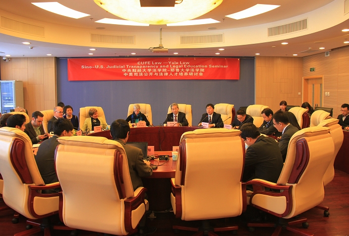 2013年10月16日上午,中央财经大学法学院与耶鲁大学法学院共同举办的“中美司法公开与法律人才培养”研讨会在中央财经大学学术会堂606室举行。来自耶鲁大学法学院、耶鲁大学中国法律中心的Jamie Horsley教授、Robert Williams教授、Jeremy Daum教授、Raymond Lu教授,和美国联邦地区法院的Barbara Rothstein法官、Stephen Smith法官出席会议。我院院长郭锋教授、陈华彬教授、曹富国教授、高秦伟教授、杜颖教授等10多位教师和部分本科生、研究生参加会议。研讨会由我院高秦伟教授和耶鲁大学中国法律中心主任Jamie Horsley教授共同主持。