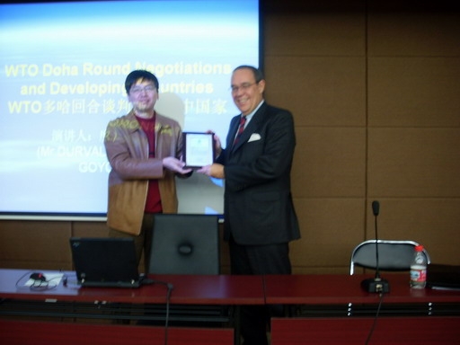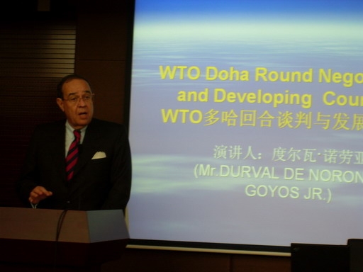 11月6日下午,应法学院邀请,巴西诺劳亚律师事务所的著名律师,度尔瓦·诺劳亚 (DURVAL DE NORONHA GOYOS JR.) 先生在中财大厦二楼会议厅以“WTO 多哈回合谈判与发展中国家”为题发表了学术演讲。