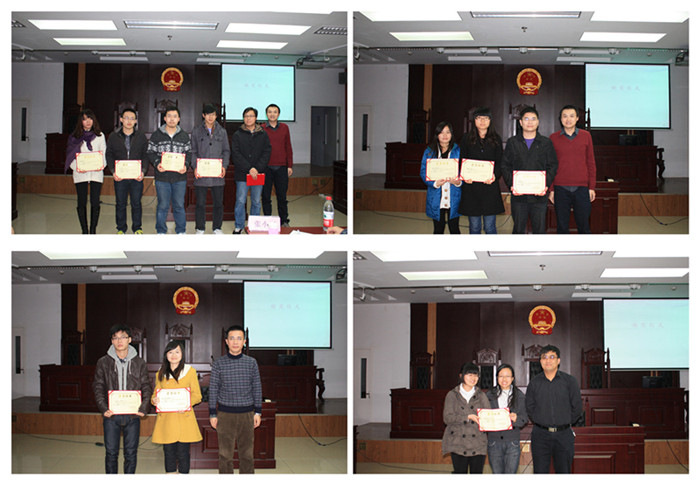 在最后的颁奖仪式上,三位评委老师分别为获奖选手颁奖并合影留念,历时近3个小时的案例分析大赛复赛也在热烈欢快的氛围中圆满落下帷幕。比赛结束后一些选手还不舍离去,依然留下来与评委老师继续探讨案例中的问题,选手们和现场观众都表示通过这次比赛学到了很多法律问题的思考方法和分析技巧,这些使他们受益匪浅。