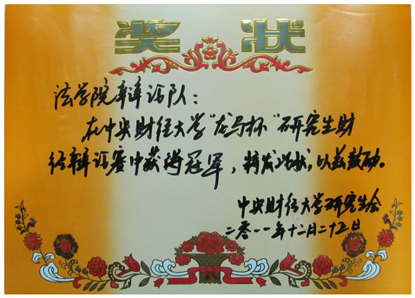 12月25日圣诞夜晚七点,由校研究生会主办的“龙马杯”研究生辩论赛在经历了一个多月数十场辩论盛宴之后拉开了决赛的精彩序幕,由我院研究生辩论队迎战政府管理学院研究生辩论队,在经过了一个多小时唇枪舌剑的攻辩大战之后,我院研究生辩论队荣膺本届辩论赛冠军。夺冠的兴奋洋溢在辩论队每个成员的脸上,祝贺的掌声在赛场内回响,这一荣誉的取得正是对法学院研究生辩论队成立以来最大的鼓舞和对法学院研究生会工作开展的切实肯定,它激励着法学院的研究生们更加努力拼搏,为研究生团体争光,为法学院争光!