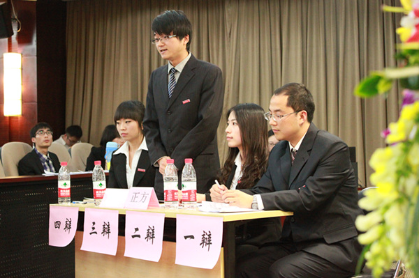 为保证本届大赛评审的公正公平,我院研究生会经参赛双方辩论队同意,邀请到七位来自行政机构、司法机关、高校、企业法律部门及仲裁委员会、律师事务所等机构的法学教授及法律工作者担任本场决赛的评委,分别为国务院法制办公室陈培勇处长、北京师范大学法学院副院长梁迎修副教授、最高人民法院民四庭麻锦亮法官、宏源证券股份有限公司法律合规总部谢鲲经理、中国国际经济贸易仲裁委员会、海南仲裁委员会仲裁员沈伟先生、大成律师事务所高级合伙人申林平律师及汇佳律师事务所高级合伙人邱宝昌律师。