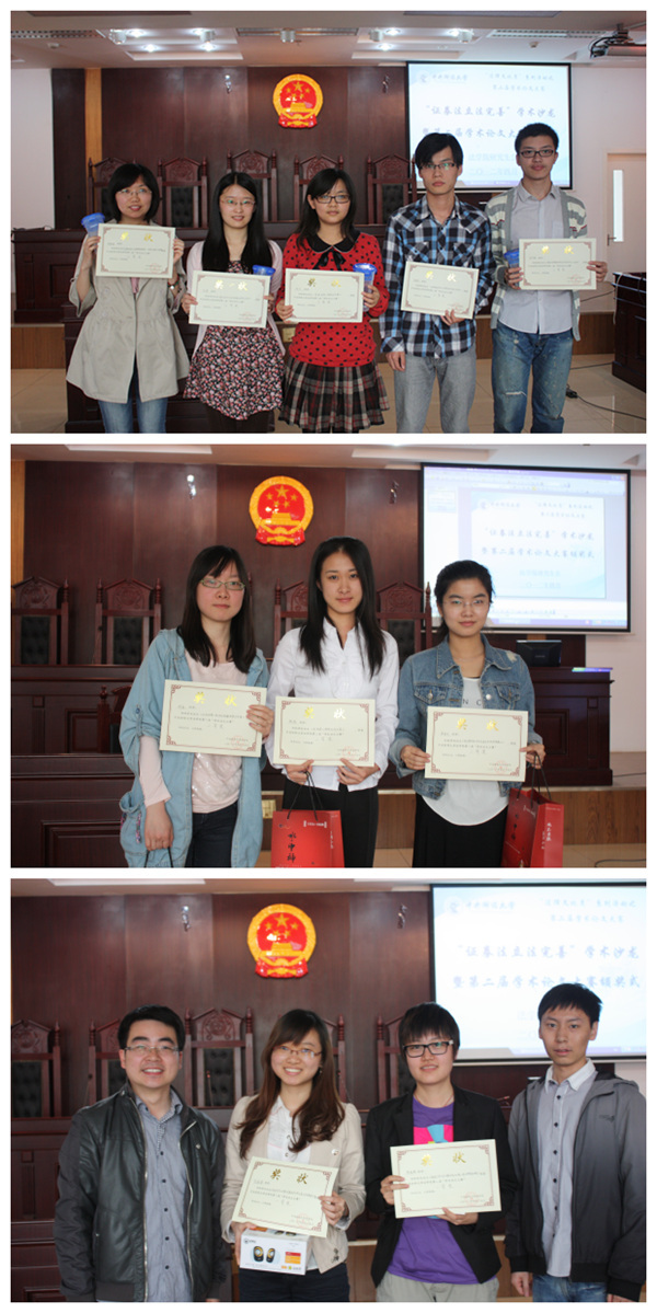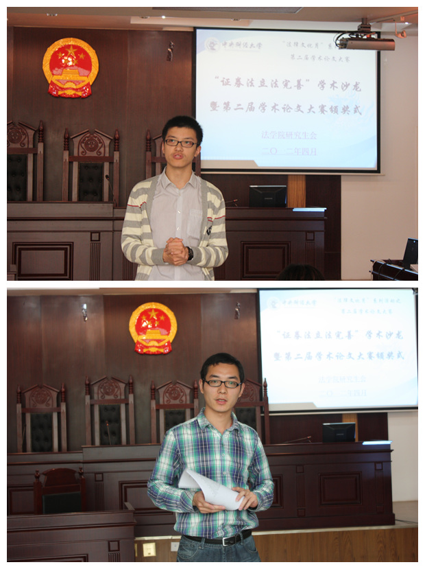 4月15日上午10点,由院研究生会学术部策划并主办的“证券市场立法完善”学术沙龙暨法学院第二届学术论文大赛颁奖式在中财大厦二层模拟法庭拉开帷幕,该学术沙龙系院研究生会2012年“法律文化月”之“法制前沿”系列活动的第三场,活动举办的目的旨在通过学术沙龙的形式对我院第二届学术论文大赛的参赛作品进行交流学习,对证券市场立法完善的学术观点进行分享切磋。