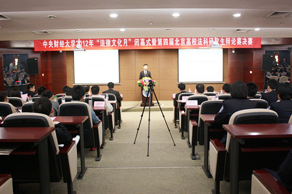 4月25日晚19点,中央财经大学2012年“法律文化月”闭幕式暨第四届北京高校法科研究生辩论赛决赛于中财大厦二层报告厅隆重举办。中央财经大学法学院院长郭锋教授、副院长刘双舟教授,中国人民公安大学研究生部学生大队大队长刘虎老师、大队长齐书发老师,中国人民公安大学研究生部团总支书记周陆涵老师,中央财经大学校研究生会秘书长黄昊老师、法学院辩论队指导教师沈健博士以及校研究生会、各高校法学院研究生会和各兄弟院系研究生会代表出席了本次闭幕式。闭幕式由法学院研究生会副主席霍鹏宇同学主持。