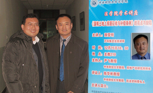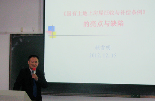 颜雪明律师的讲座主要是从《征收补偿条例》相对于《拆迁条例》的区别、《征收补偿条例》自身的亮点和缺陷等几个方面问题来阐述。