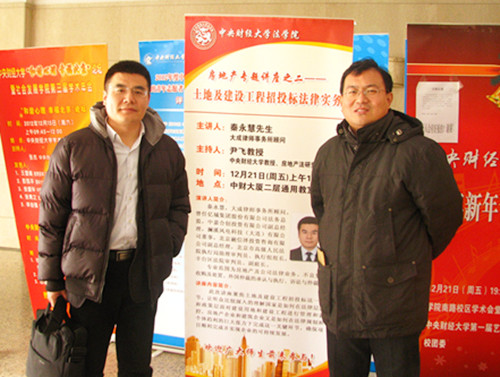 12月21日上午10点,大成律师事务所顾问秦永慧先生做客“法律实务论坛”,以“土地及建设工程招投标法律实务”为题进行专题讲座。活动在中财大厦二层通用教室三举行,秦永慧先生对建设工程招投标进行了细致讲解。房地产法研究所所长尹飞教授主持了本场讲座。