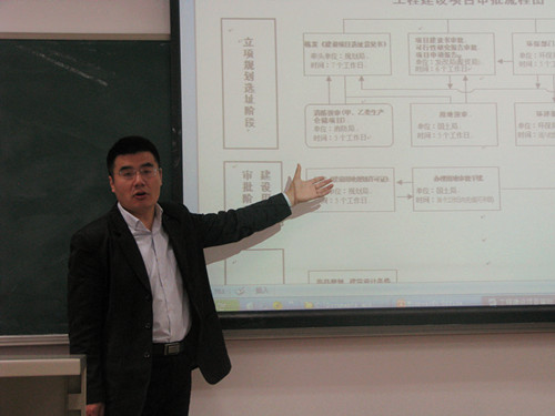 秦永慧先生首先介绍了建设工程招投标的前一环节——建设工程立项报批的流程、报审部门等基本情况,随之引出建设工程招投标。秦先生大体总结了实践中建设工程招投标的现状,并从法律、行政法规、地方法规、规章几个层面介绍了我国在这一环节的立法,并着重强调了招投标的适用范围。此外,秦先生向同学们讲解了招投标相关的建设项目融资模式,如设计采购施工模式(EPC)、设计施工总承包模式(DB)、建设经营转让模式(BOT)等,引起了同学极大的兴趣。最后介绍了招投标的流程及实务中的建设工程“黑白合同”问题。