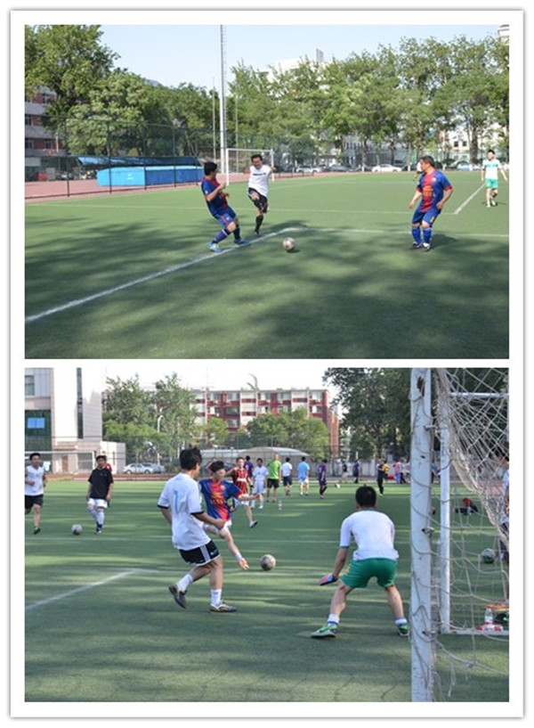 随着2013级法学研班的陈登宇同学,作为裁判员吹响开场哨,比赛正式开始。第一节比赛,教职工队取得梦幻般开局。第4分钟,程曦接尹飞传球在右路大禁区劲射打破僵局,教职工队1:0领先。随后,教职工队在场面上依然占据主动。第7分钟,尹飞接高秦伟传球在大禁区右侧劲脚抽射,破门得分,教职工队2:0领先。第9分钟,中交建队通过严密的防守反击,通过快攻破门得分。第12分钟,教职工队前场发球,足球落在对手门前,导致双方混战,程曦单枪匹马杀入禁区,连续摆脱对方多名防守队员,一脚推射将球送入网窝。