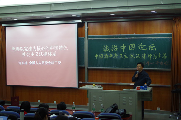 11月28日晚,法治中国论坛系列讲座之《完善以宪法为核心的中国特色社会主义法律体系》在沙河校区东区学院3号楼222室举行。此项活动由我校党委宣传部、学工部和法学院共同主办,法学院研究生会和学生会共同承办。全国人大常委会法制工作委员会办公室主任、法学院兼职教授许安标先生主讲了此次报告;我院蒋劲松教授为本次讲座的主持人,法学院党总支书记李岩老师、院长助理李伟副教授出席了本次讲座。