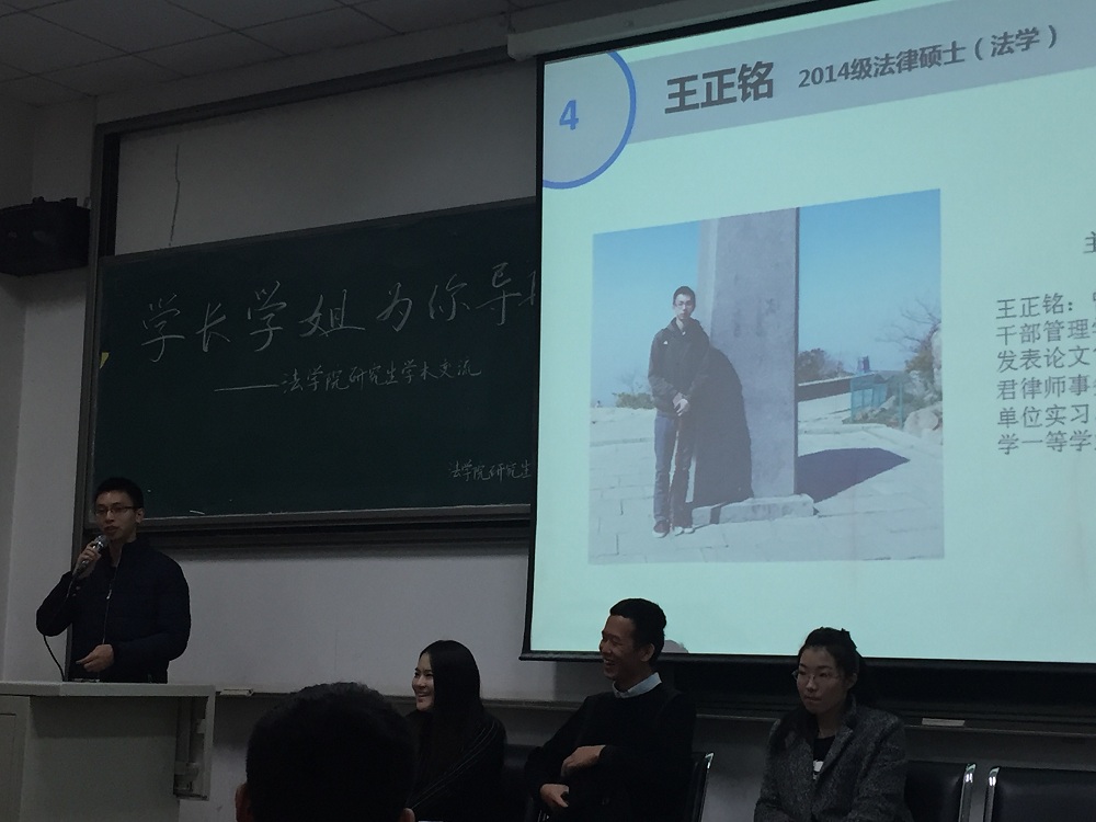 随后2014级法律硕士(法学)王正铭学长从研究生期间如何安排学习与生活方面分享自己的经验。学长以表格的方式,从学习成绩、学术研究、社会工作、实习实践四个方面向我们展示了学业奖学金与国家奖学金的评奖规则以及同学们应该做的必要准备。