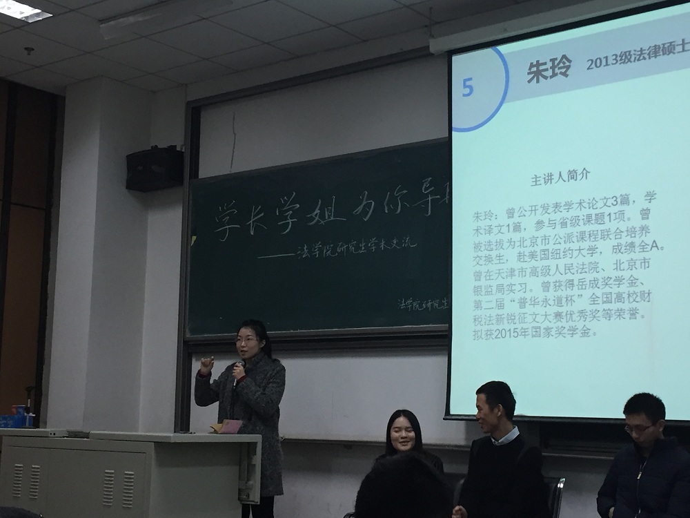 最后13级法律硕士(非法学)朱玲学姐分享经验。朱玲学姐以自己发表的文章为例,向我们传授写作论文的经验:多听讲座,了解更多前沿资料,为论文写作准备素材;理清写文章的逻辑思维。首先要明确的是写什么,其次是必要性与可行性,再次是写作事物合法化的挑战,最后是对问题的规范与建议;将旧题材写出新意,用法规的对比检索新旧法规的在研究方向上的不同。