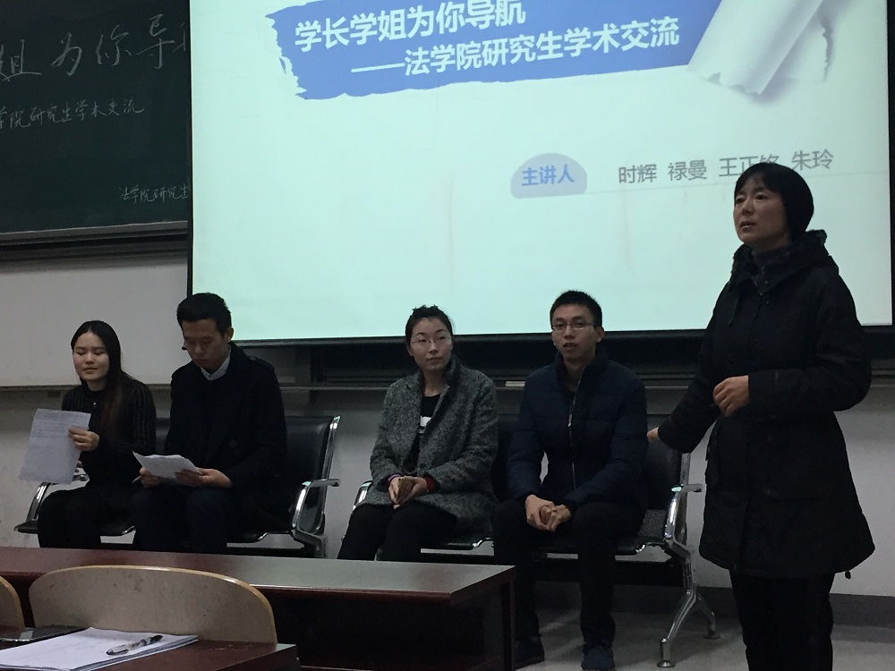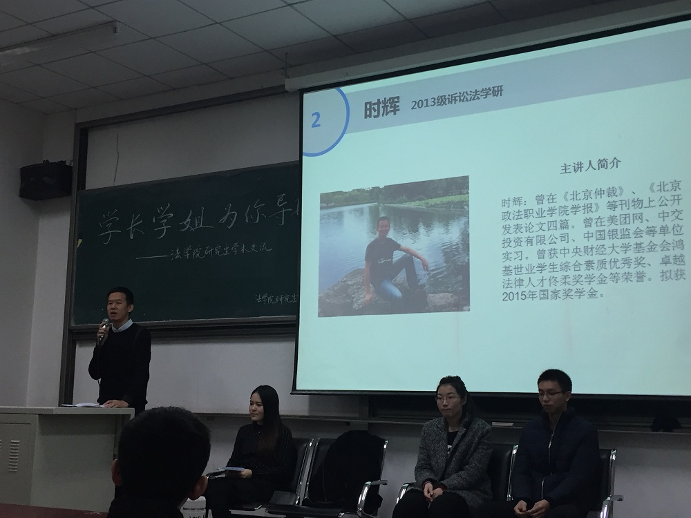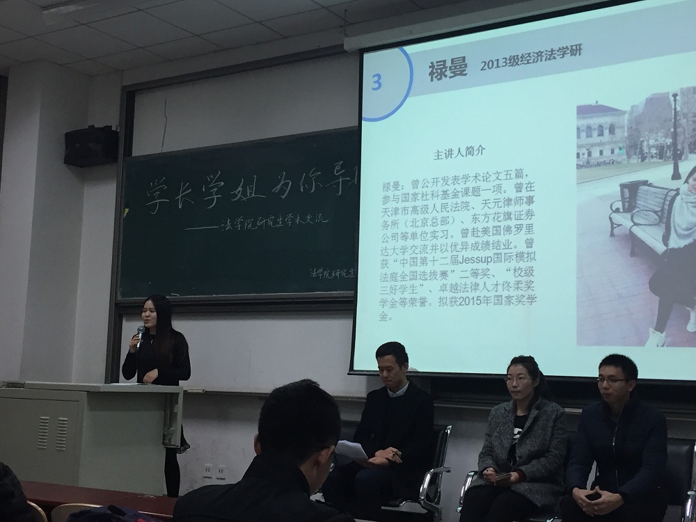 2015年11月19日上午8点30分,由法学院研究生会举办的“学长学姐为你导航”系列活动--研究生学术交流讲座在沙河校区主教106举行,蒙广平老师参加了此次讲座,并就学院奖励、学业奖和国家奖学金等的细则做了简单介绍,希望同学们在学术科研方面投入更多些精力。此次讲座的主讲人包括13级经济法学研究生禄曼学姐、诉讼法学研究生时辉学长、14级法律硕士(法学)王正铭学长以及13级法律硕士(非法学)朱玲学姐。