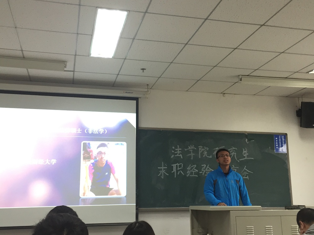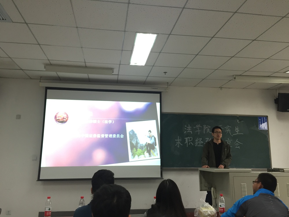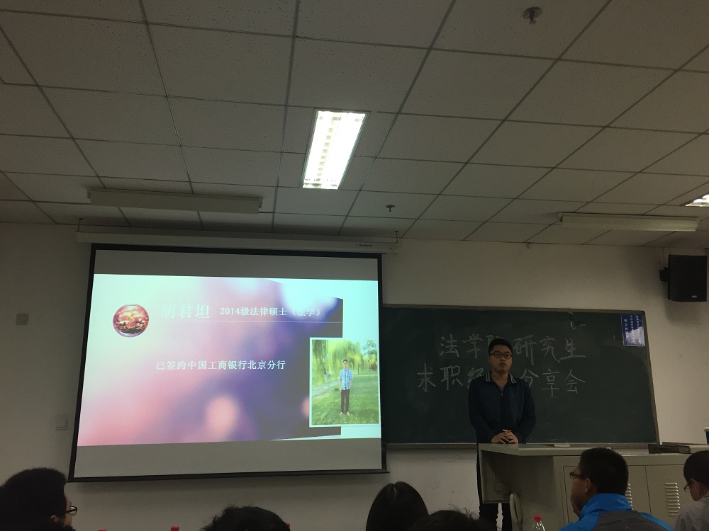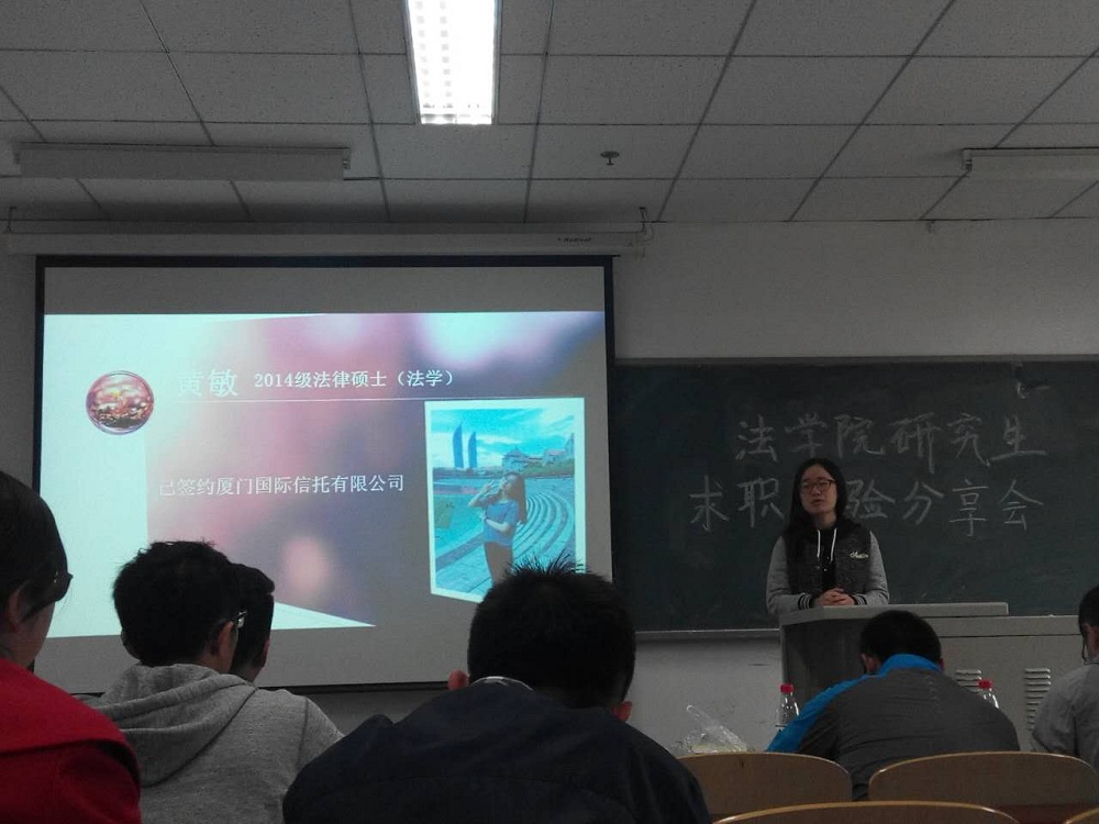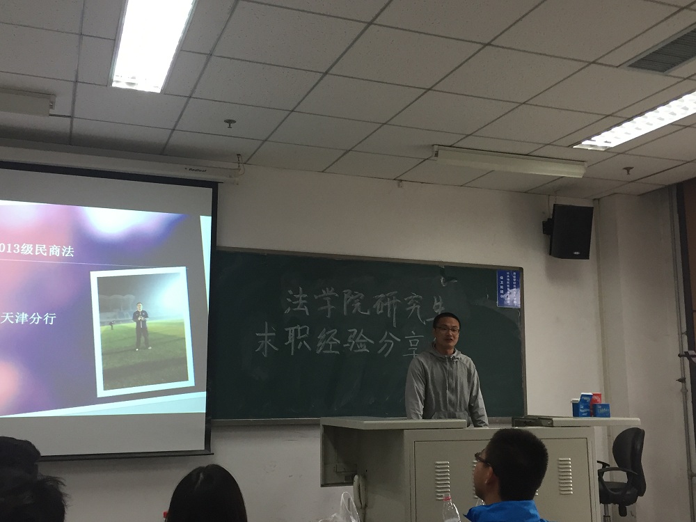 2016年4月19日早8点,由法学院研究生会举办的研究生求职经验分享会在沙河校区主教508举行。来到本次分享会的的嘉宾分别是2013级民商法学硕士研究生陈登宇、2013级法硕(非法学)研究生尹力沉、2014级法硕(法学)研究生胡君坦、2014级法硕(法学)研究生唐志华和2014级法硕(法学)研究生黄敏。他们分别签约了招商银行天津分行、中央财经大学、中国工商银行北京分行、中国证券监督管理委员会和厦门国际信托有限公司。