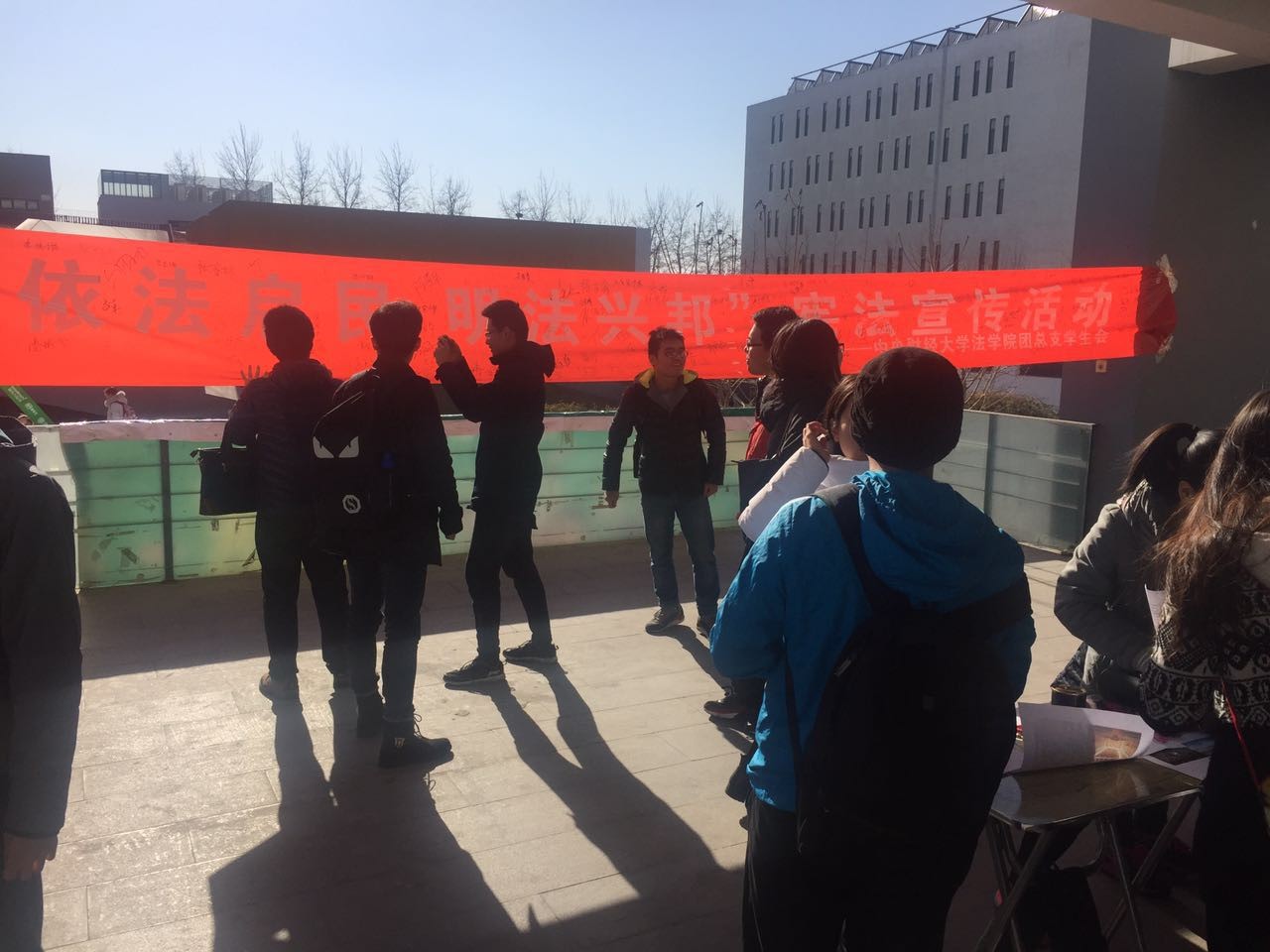 上午11点,宪法宣传小组就已经为本次活动的展开做好了布置,主要是摆放易拉宝、悬挂横幅、安放活动器材等一系列的工作。在一切准备活动就绪之后,活动就此展开。