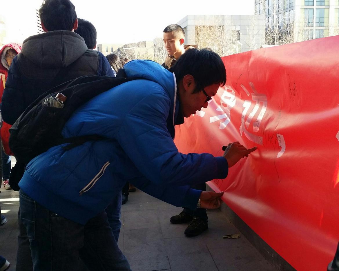 虽然寒风凛冽,但学生会干事们和13-14级联合党支部的同学热情不减,他们大声呼喊着“背法条,抽好礼”的活动口号,同时主动走向同学,向他们讲解相关的法律知识及本次活动的规则和意义。越来越多的同学来到活动地点参与活动,场面十分热闹。参与同学在抽到法条后,全心投入,认真背诵,一丝不苟。现场气氛十分活跃,不少同学展示了自己惊人的记忆力,浏览一遍后就顺畅地背诵出来,得到相应的奖励。虽然也有同学没有在规定时间完成任务,但他们也表示,在法制宣传日,只要参加了这些活动,就很有意义了。同学们在参加活动之余,也纷纷走到横幅旁,郑重地签上自己的姓名,也签上了对法治建设的信心,对法治中国的寄语。在整个过程中,同学们积极参与,既轻松地学习法律知识,又深入了解宪法历史,可谓一举两得。