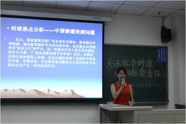最后是2013级3班代表队发表观点,3班小组的5名同学分别就时政、责任,广电总局政策的利弊以及这一政策带来的社会影响和补救措施几个方面表达了自己的看法。伍可盈同学针对美剧下架这一现象提出了应增强行业自律、完善行业法律法规、建立分级制度、增加对政府政策的理解等建议。张灵珊同学在最后做了简短的总结,认为大众对这一事件的态度反应了公民对规范、唤醒公权力的需求。在回答评委提问中,杨巩同学对结合视频网站近年来的发展状况发表自己独到的见解,获得了评委们的一致认可。