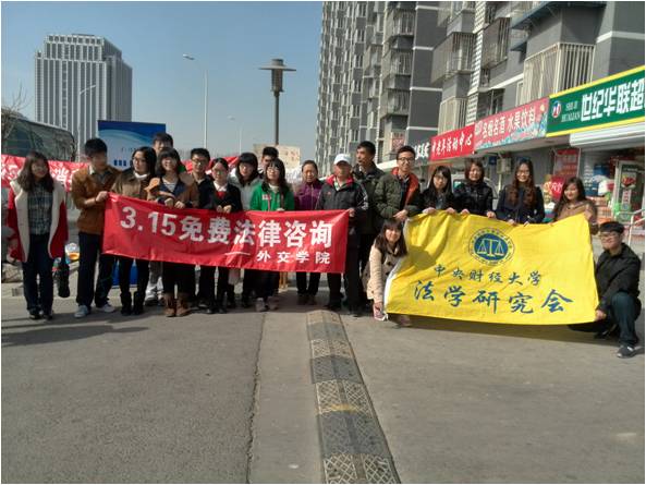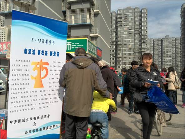 3月15日上午8点30分,我校法学研究会同外交学院一起,来到沙河镇兆丰家园社区,并联合当地司法局共同举办了宣传3·15 消费者权益保护的活动。我校参与本次活动的有法学研究会副会长沈明杰、外联部部长覃妍、组织部部长任政洁以及其他干事。本次活动的主要目的是进社区宣传消费者权益保护的有关知识,给社区居民一些法律上的帮助,送法进社区。