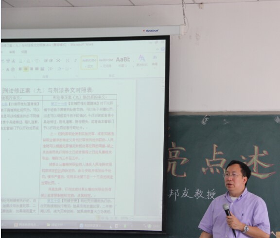 2015年9月16日下午两点,我院在东区主教306教室成功举办“《刑法》修改亮点述评“讲座,李邦友教授以专业角度深入解读《刑法》修正案(九),为同学们学习和研究刑法提供了巨大的帮助。参加讲座的还有我院14级辅导员程曦老师。