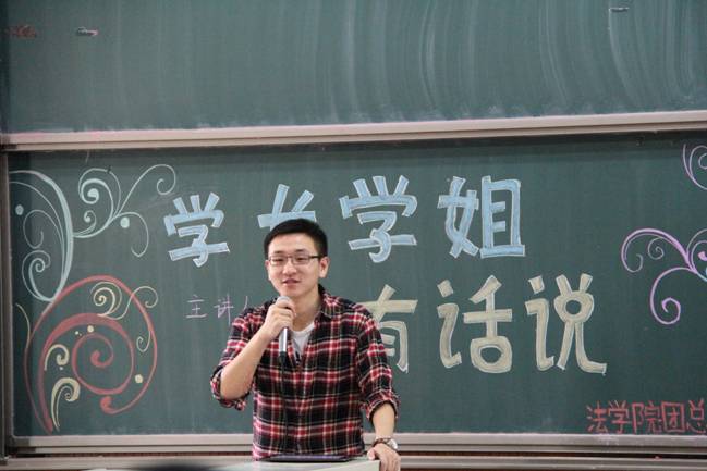 11月14日下午1点30分由法学院团总支学生会主办的“学长学姐有话说”系列讲座在学院7号楼115开讲。本次讲座的主讲人为法学院04级陈帆同学与10级史梁同学。法学院党总支书记李岩老师和学生办公室主任吴垠老师出席了本次分享会,法学院团总支书记李杰老师在交流会开始之后来到了现场,12级全体同学到场参加了讲座。