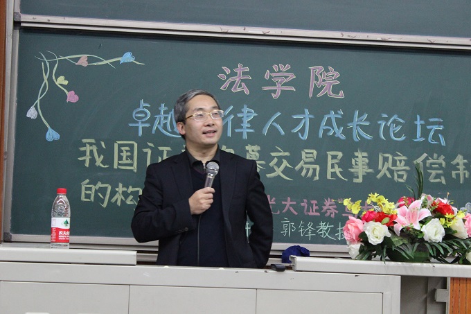 12月26日晚6点30分,我院卓越法律人成长论坛法学前沿第六讲在沙河校区七号楼115教室如期举行,本次讲座由我院院长郭锋教授主讲,主题为我国证券内幕交易民事赔偿制度的构建——以光大证券“乌龙指”为例。我院院长助理李伟副教授、团总支书记李杰老师以及13级全体本科生、部分11级、12级本科生参加了本次讲座。