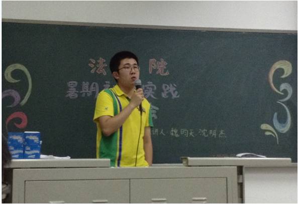 沈明杰同学首先为大家介绍了他对于暑期社会实践活动的心得与体会。沈明杰同学坦诚幽默地向大家分享了他在暑期社会实践宣讲会中的经历、经验。他讲到,暑期社会实践活动不止是在于其与学分和综测挂钩,同学们不应当如此功利地去对待,既然做了,不如就做好,从中有所得,享受乐趣、提高自己。他在展示的幻灯片中写到,暑期实践让我们有机会了解、接近我们所不知道的世界,教会我们看我们所不知道的世界的方法。他还讲到了在暑期实践活动的组队中,应当注意每个人充分发挥在团队中所充当角色的作用,每个人尽好自己的本分。