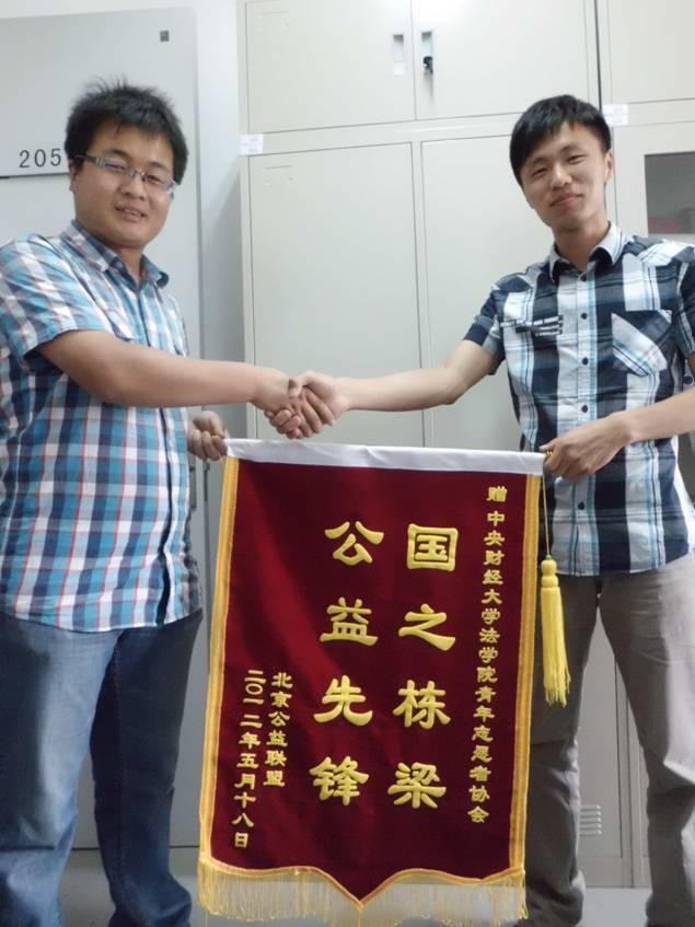 5月22日上午,残疾人代表及北京公益联盟负责人向我院送来一面绣有“国家栋梁,公益先锋”的锦旗,对我院志愿者在“圆梦故宫”志愿活动中的奉献表示感谢。院团总支书记李杰以及青年志愿者协会部长荣宏橙代表学院接受了锦旗。