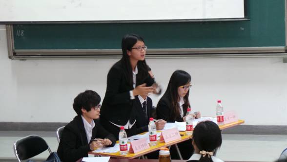 在主持人简要介绍参赛双方以及出席的评委,两方辩论队队员自我介绍后,本场辩论赛正式开战。首先是由我院一辩杨幸媛同学陈词立论。她准确地剖析了此次辩题的含义,并从功利色彩的本质以及其给现代生活带来的有利影响等方面完整地陈述了我方观点。紧接着,对方二辩立即反驳我方一辩,而接下来我方二辩沈明杰同学也有利地反驳了对方一辩的陈词。其后,经过双方三辩和四辩的激烈交锋,比赛来到了对辩环节。在此环节中,对方一辩针对我方辩题就功利色彩的增强会违背社会发展的协调性、可持续性以及会造成道德滑坡三个方面进行了盘问,而我方以发达国家的长期发展历程为例对此进行了有效地反驳。