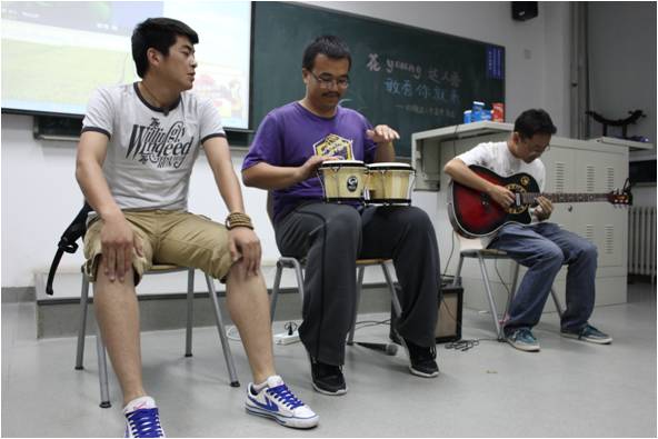 第五个节目是来自2012级1班王艺然同学的小提琴独奏,琴声悠扬悦耳,只是因为紧张有一些小的失误。第六个节目是来自2011级的吴认桓同学演唱的《淘汰》,同样演绎得情感真挚,嗓音动人。第七个节目是由2013级的梭娅同学和许心韵同学带来的民谣吉他弹唱,悦耳动听的几首民谣演唱之间,还有对人生旅程的感悟的独白,梭娅同学的歌喉和许心韵同学的伴奏和伴唱相得益彰,令人沉醉。最后一个节目也是歌曲串烧的形式,来自2013级的万彬同学、扎西加措同学和张夏明同学以鼓和吉他伴奏进行了演唱,极具民族风情。