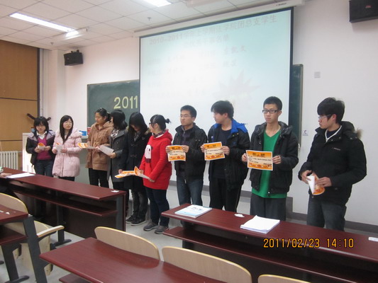 2011年2月23日下午,我院在主教210教室召开全体团学干部会议。会议由团总支组织部负责人武静同学主持,团总支书记李炎老师出席本次会议。
