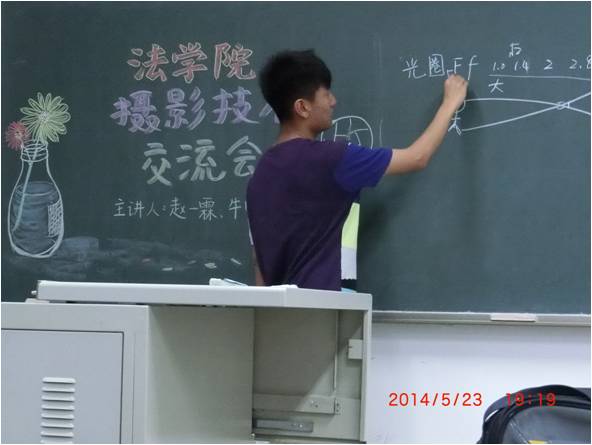 首先是摄影社社长赵一霖同学为大家讲解一些基本的摄影方面的理论,包括光圈、快门、感光度、景深以及白平衡。赵一霖同学认真地在黑板上写出相应要点,为大家详细地讲解摄影的基本理论。在谈到大家比较陌生的景深和白平衡时,赵一霖同学以大家日常生活常见的事物为例,将生涩的理论知识寓于简单寻常的例子中娓娓道来。