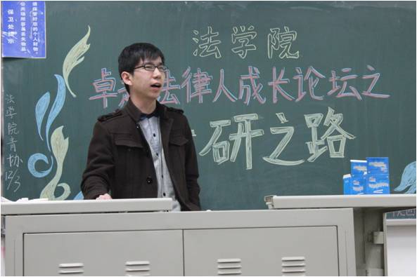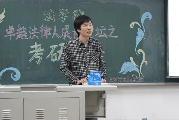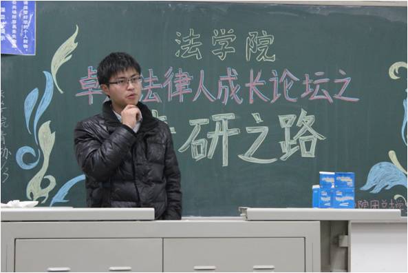 随后是邱刘振同学发言,他结合自身的心路历程给大家分享了几点经验。一是“敢想”,只要心有多远,你就能走多远;二是“肯干”,拥有平实的心境和踏实的态度是成功的基石;三是“熟能生巧”,重复造就卓越。其间,他也和同学们分享了在考研前的三个月他的学习生活状态,给大家讲了他对于考研和司法考试的权衡处理,鼓励我们像对待高考那样去对待研究生考试。他的发言幽默风趣,现场掌声不断。