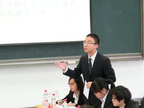 在最为精彩的自由辩论环节中,双方唇枪舌剑,交锋极为激烈。我方以大量时新实例和犀利的语言向对方辩手连续发问,取得了巨大的场面优势。最后,在总结陈词中,我方四辩马靖同学先是反驳对方观点,指出竞技体育在发展,而国民体质却在下降;随后又立足我方根本观点,说明中国由体育大国走向体育强国的必经之路是全民体育,而不是竞技体育,为我方陈词做了一个圆满的总结。