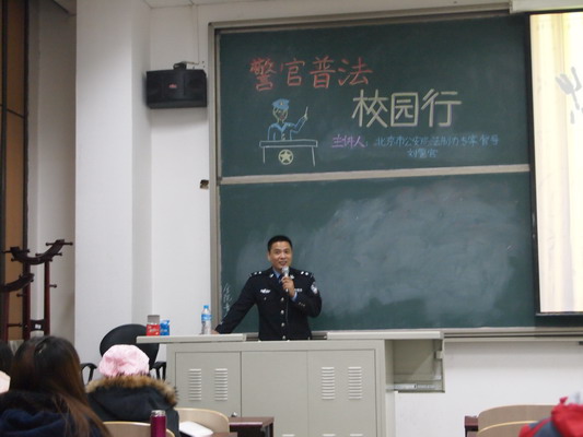 12月5日晚,“警官普法校园行活动”如期举行,北京市公安局法制办公室刘德强警官应邀在沙河校区主教106教室为同学们作了关于高校校园安全问题的讲座,刘警官通过大量生动的案例,详细讲解了如何防范人身侵害、如何保护自己的财产安全,提高了同学们的自我保护意识。