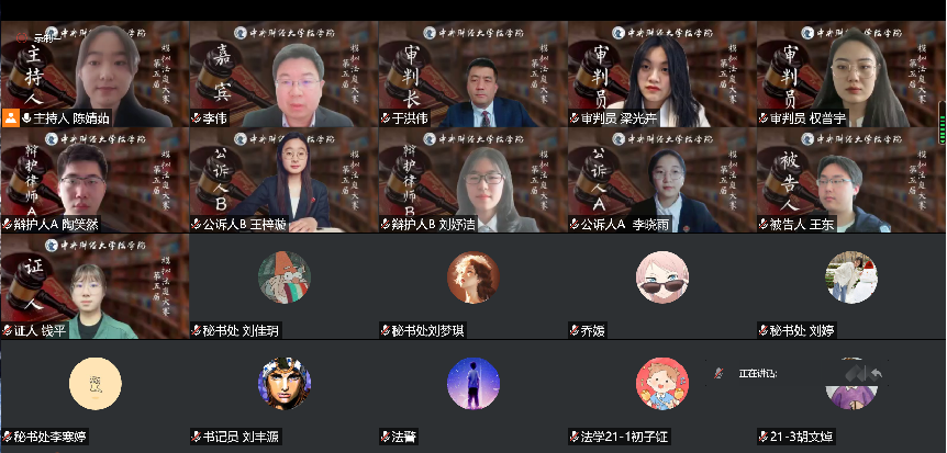 3月15日,模拟法庭大赛预选赛开赛,经过法律文书写作筛选,共有12支队伍顺利进入初赛。初赛以线上抽签的形式决定控辩双方,并以小组赛方式选拔。经过激烈比拼,共有6支队伍成功晋级复赛。复赛于4月16日至4月18日举行,经过分组对抗与文书写作两轮淘汰,最终“阿对对队”与“上下求索队”脱颖而出,挺进决赛。