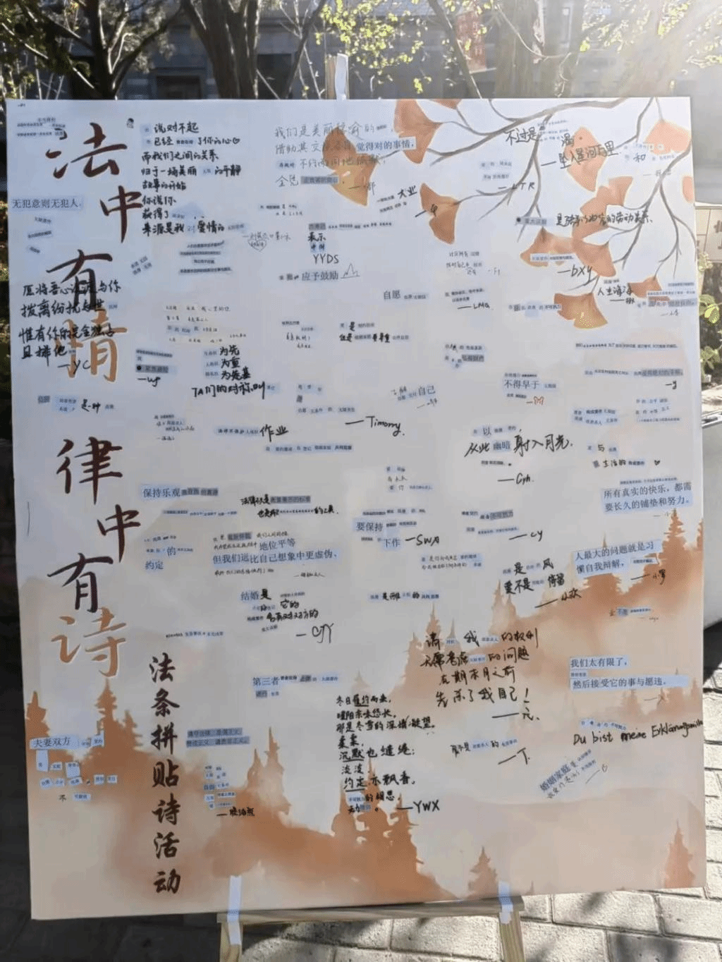 由法学院卓越法治人才培养德育示范基地主办,法学院团委青年志愿者协会承办的“法中有情,律中有诗”法条拼贴诗活动顺利开展,同学们踊跃参加,思维丰富,将法理与诗情相融合,创作出了众多精彩作品。这场别开生面的活动吸引了众多学生的参与,以创新的方式传播了法律知识,同时也引领了一场关于法治文化的热议。